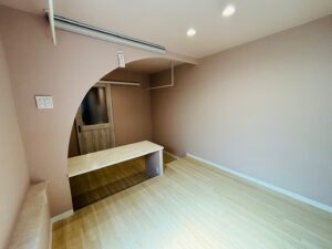 壁のクロスは淡いピンクで落ち着いた雰囲気に。